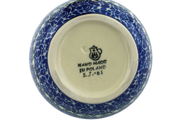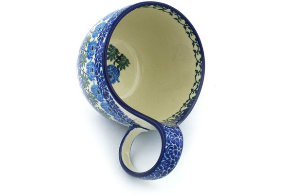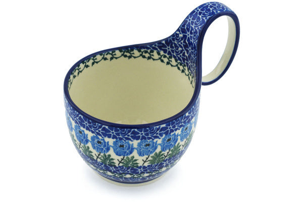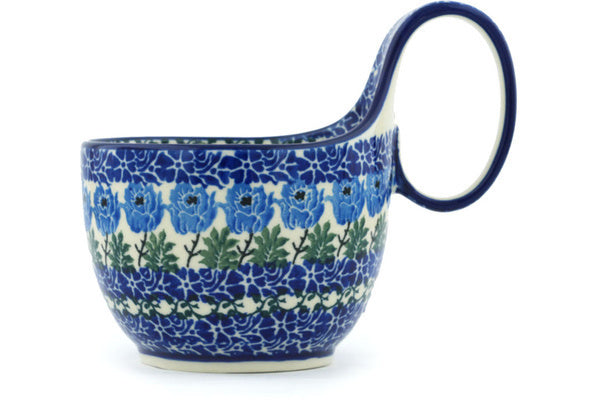 This Blue Rosette Wreath 16 oz Bowl with Loop-Handle was handmade and hand decorated in Boleslawiec, Poland by skilled artisans according to old traditional methods. This Polish stoneware is microwave, dishwasher, freezer, and oven safe up to 480°F. It does not contain lead or cadmium. It is part of the Blue Rosette Wreath Collection.