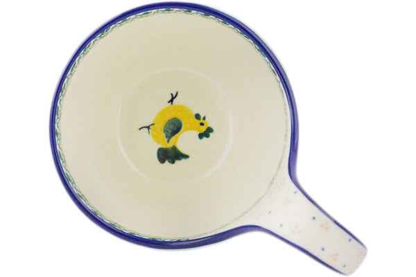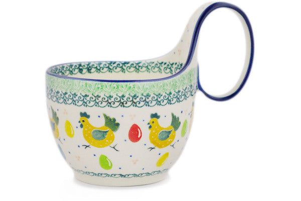 This Egg Hunt 16 oz Bowl with Loop-Handle was handmade and hand decorated in Boleslawiec, Poland by skilled artisans according to old traditional methods. This Polish stoneware is microwave, dishwasher, freezer, and oven safe up to 480°F. It does not contain lead or cadmium. It is part of the Egg Hunt Collection.