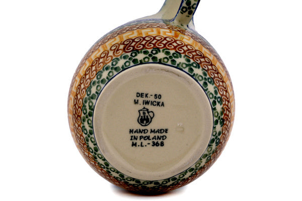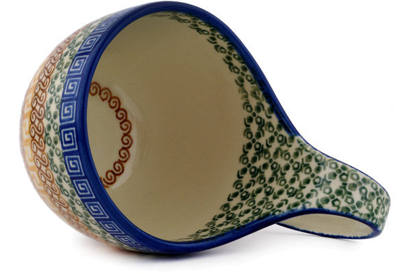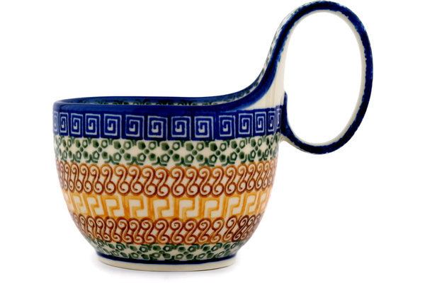 This Grecian Sea 16 oz Bowl with Loop-Handle was handmade and hand decorated in Boleslawiec, Poland by skilled artisans according to old traditional methods. This Polish stoneware is microwave, dishwasher, freezer, and oven safe up to 480°F. It does not contain lead or cadmium. It is part of the Grecian Sea Collection.