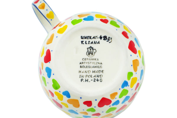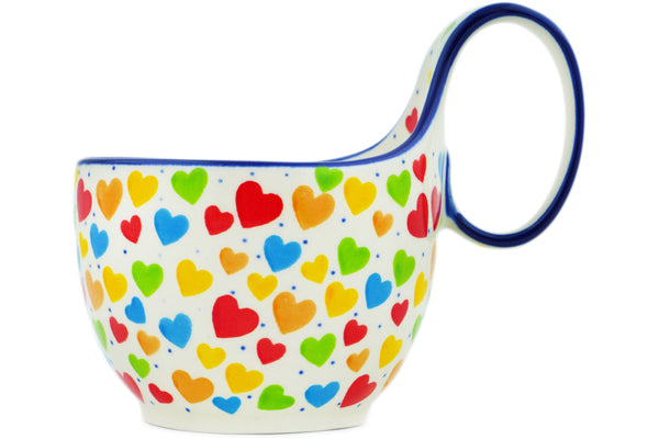 This In Love With Love 16 oz Bowl with Loop-Handle was handmade and hand decorated in Boleslawiec, Poland by skilled artisans according to old traditional methods. This is a Polish pottery Signature Unikat, which means that it has been hand painted with both sponges and brushes and it is signed by the artist who painted it. Unikat pieces are the most intricate works of art. Larger Unikat items take hours of very careful work to finish. This Polish stoneware is microwave, dishwasher, freezer, and oven safe up to 480°F. It does not contain lead or cadmium. It is part of the In Love With Love Collection.