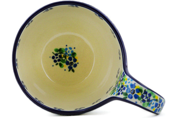 This Morning Glory 16 oz Bowl with Loop-Handle was handmade and hand decorated in Boleslawiec, Poland by skilled artisans according to old traditional methods. This is a Polish pottery Signature Unikat, which means that it has been hand painted with both sponges and brushes and it is signed by the artist who painted it. Unikat pieces are the most intricate works of art. Larger Unikat items take hours of very careful work to finish. This Polish stoneware is microwave, dishwasher, freezer, and oven safe up to 480°F. It does not contain lead or cadmium. It is part of the Morning Glory Collection.