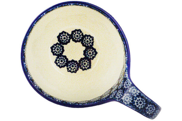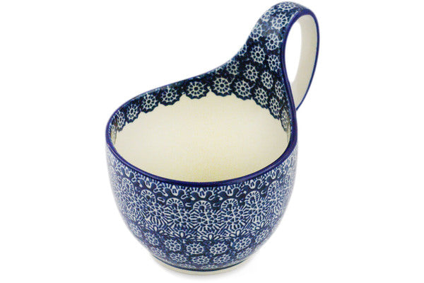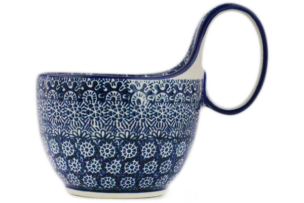 This Night At Sea 16 oz Bowl with Loop-Handle was handmade and hand decorated in Boleslawiec, Poland by skilled artisans according to old traditional methods. This Polish stoneware is microwave, dishwasher, freezer, and oven safe up to 480°F. It does not contain lead or cadmium. It is part of the Night At Sea Collection.