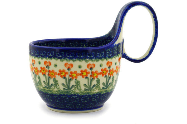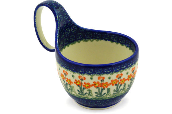 This Peach Spring Daisy 16 oz Bowl with Loop-Handle was handmade and hand decorated in Boleslawiec, Poland by skilled artisans according to old traditional methods. This Polish stoneware is microwave, dishwasher, freezer, and oven safe up to 480°F. It does not contain lead or cadmium. It is part of the Peach Spring Daisy Collection.