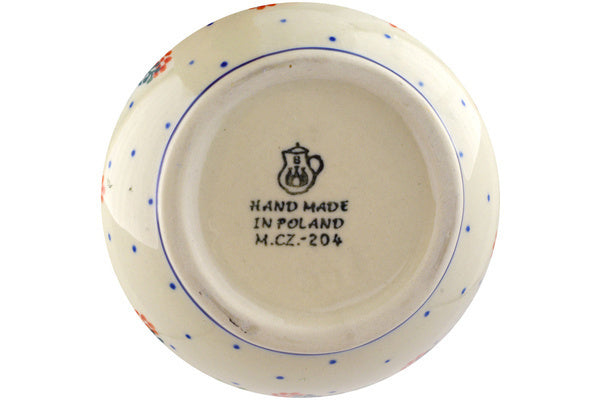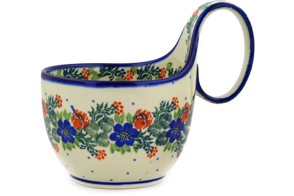 This Polish Wreath 16 oz Bowl with Loop-Handle was handmade and hand decorated in Boleslawiec, Poland by skilled artisans according to old traditional methods. This Polish stoneware is microwave, dishwasher, freezer, and oven safe up to 480°F. It does not contain lead or cadmium. It is part of the Polish Wreath Collection.