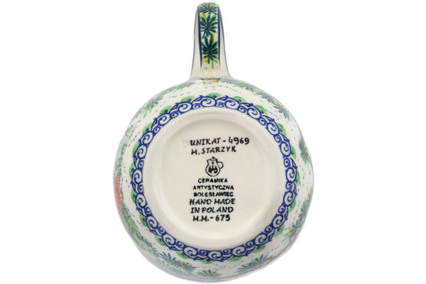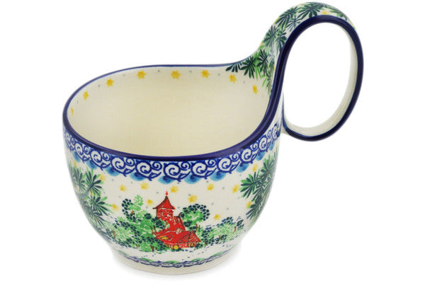 This Cozy Bullfinch 16 oz Bowl with Loop-Handle was handmade and hand decorated in Boleslawiec, Poland by skilled artisans according to old traditional methods. This is a Polish pottery Signature Unikat, which means that it has been hand painted with both sponges and brushes and it is signed by the artist who painted it. Unikat pieces are the most intricate works of art. Larger Unikat items take hours of very careful work to finish. This Polish stoneware is microwave, dishwasher, freezer, and oven safe up to 480°F. It does not contain lead or cadmium. It is part of the Cozy Bullfinch Collection.