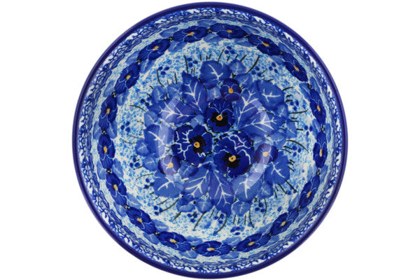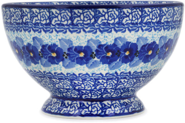This Deep Winter 5" Bowl with Pedestal was handmade and hand decorated in Boleslawiec, Poland by skilled artisans according to old traditional methods. This is a Polish pottery Signature Unikat, which means that it has been hand painted with both sponges and brushes and it is signed by the artist who painted it. Unikat pieces are the most intricate works of art. Larger Unikat items take hours of very careful work to finish. This Polish stoneware is microwave, dishwasher, freezer, and oven safe up to 480°F. It does not contain lead or cadmium. It is part of the Deep Winter Collection.