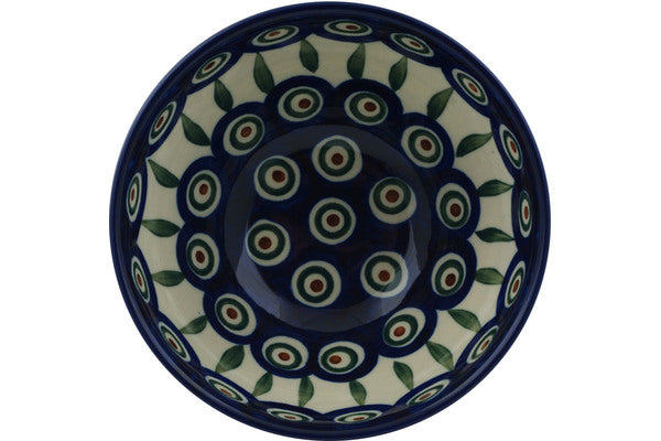 This Peacock Leaves 5" Bowl with Pedestal was handmade and hand decorated in Boleslawiec, Poland by skilled artisans according to old traditional methods. This Polish stoneware is microwave, dishwasher, freezer, and oven safe up to 480°F. It does not contain lead or cadmium. It is part of the Peacock Leaves Collection.