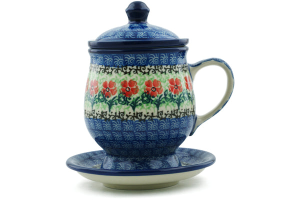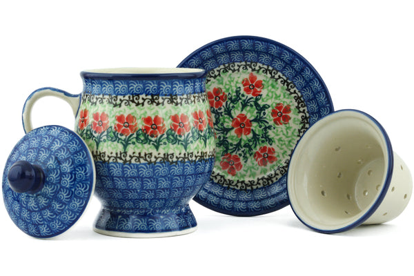 This Maraschino 10 oz Brewing Mug was handmade and hand decorated in Boleslawiec, Poland by skilled artisans according to old traditional methods. This Polish stoneware is microwave, dishwasher, freezer, and oven safe up to 480°F. It does not contain lead or cadmium. It is part of the Maraschino Collection.