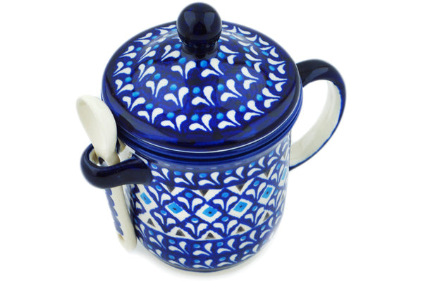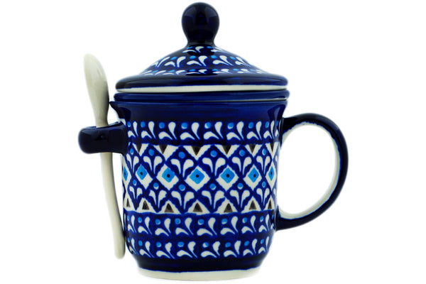 This Blue Diamond Dream 12 oz Brewing Mug with Spoon was handmade and hand decorated in Boleslawiec, Poland by skilled artisans according to old traditional methods. This Polish stoneware is microwave, dishwasher, freezer, and oven safe up to 480°F. It does not contain lead or cadmium. It is part of the Blue Diamond Dream Collection.