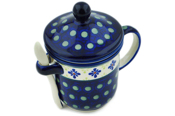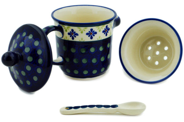 This Green Gingham Peacock 12 oz Brewing Mug with Spoon was handmade and hand decorated in Boleslawiec, Poland by skilled artisans according to old traditional methods. This Polish stoneware is microwave, dishwasher, freezer, and oven safe up to 480°F. It does not contain lead or cadmium. It is part of the Green Gingham Peacock Collection.
