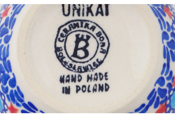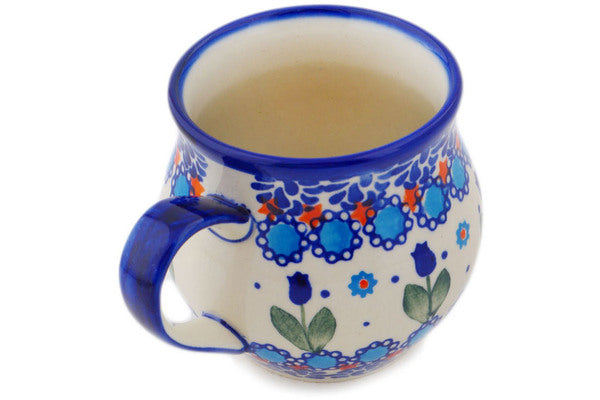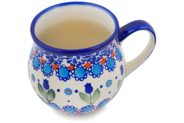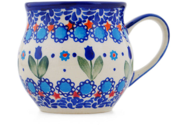 This Blue Tulip Garden 12 oz Bubble Mug was handmade and hand decorated in Boleslawiec, Poland by skilled artisans according to old traditional methods. This is a Polish pottery Signature Unikat, which means that it has been hand painted with both sponges and brushes and it is signed by the artist who painted it. Unikat pieces are the most intricate works of art. Larger Unikat items take hours of very careful work to finish. This Polish stoneware is microwave, dishwasher, freezer, and oven safe up to 480°F. It does not contain lead or cadmium. It is part of the Blue Tulip Garden Collection.