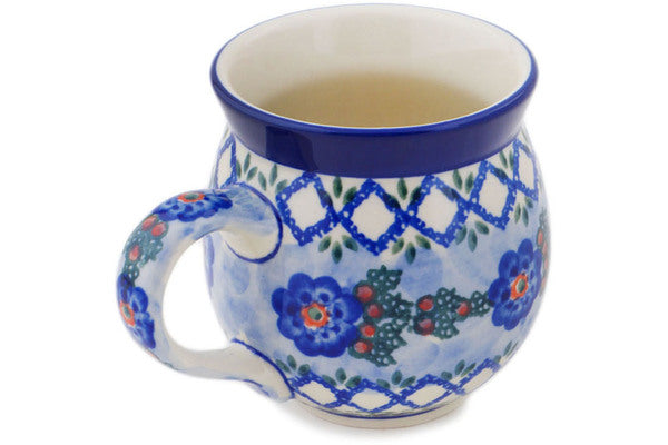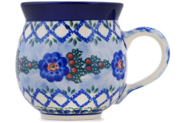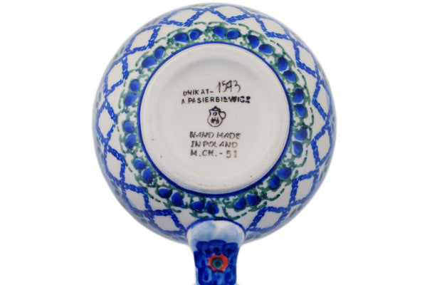 This Latice Daisy 12oz Bubble Mug was handmade and hand decorated in Boleslawiec, Poland by skilled artisans according to old traditional methods. This is a Polish pottery Signature Unikat, which means that it has been hand painted with both sponges and brushes and it is signed by the artist who painted it. Unikat pieces are the most intricate works of art. Larger Unikat items take hours of very careful work to finish. This Polish stoneware is microwave, dishwasher, freezer, and oven safe up to 480°F. It does not contain lead or cadmium. It is part of the Latice Daisy Collection.