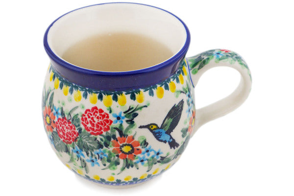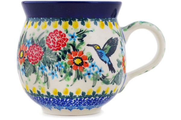 This Solo Hummingbird 12oz Bubble Mug was handmade and hand decorated in Boleslawiec, Poland by skilled artisans according to old traditional methods. This is a Polish pottery Signature Unikat, which means that it has been hand painted with both sponges and brushes and it is signed by the artist who painted it. Unikat pieces are the most intricate works of art. Larger Unikat items take hours of very careful work to finish. This Polish stoneware is microwave, dishwasher, freezer, and oven safe up to 480°F. It does not contain lead or cadmium. It is part of the Solo Hummingbird Collection.