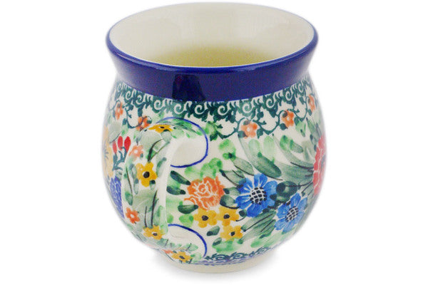 This Splendid May 12oz Bubble Mug was handmade and hand decorated in Boleslawiec, Poland by skilled artisans according to old traditional methods. This is a Polish pottery Signature Unikat, which means that it has been hand painted with both sponges and brushes and it is signed by the artist who painted it. Unikat pieces are the most intricate works of art. Larger Unikat items take hours of very careful work to finish. This Polish stoneware is microwave, dishwasher, freezer, and oven safe up to 480°F. It does not contain lead or cadmium. It is part of the Splendid May Collection.