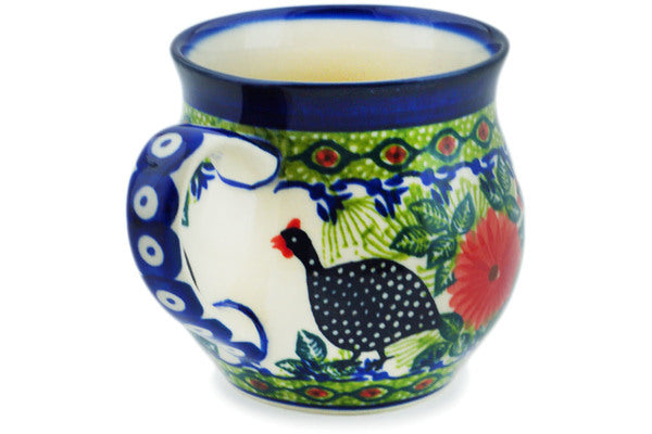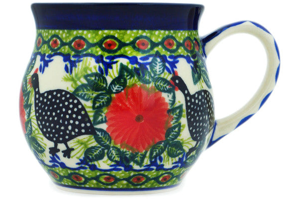This Fowl In The Florals 13 oz Bubble Mug was handmade and hand decorated in Boleslawiec, Poland by skilled artisans according to old traditional methods. This is a Polish pottery Signature Unikat, which means that it has been hand painted with both sponges and brushes and it is signed by the artist who painted it. Unikat pieces are the most intricate works of art. Larger Unikat items take hours of very careful work to finish. This Polish stoneware is microwave, dishwasher, freezer, and oven safe up to 480°F. It does not contain lead or cadmium. It is part of the Fowl In The Florals Collection.