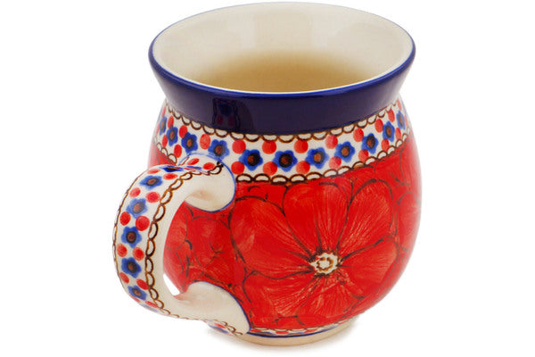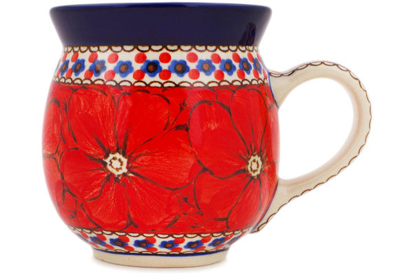 This Crimson Poppies 16 oz Bubble Mug was handmade and hand decorated in Boleslawiec, Poland by skilled artisans according to old traditional methods. This is a Polish pottery Signature Unikat, which means that it has been hand painted with both sponges and brushes and it is signed by the artist who painted it. Unikat pieces are the most intricate works of art. Larger Unikat items take hours of very careful work to finish. This Polish stoneware is microwave, dishwasher, freezer, and oven safe up to 480°F. It does not contain lead or cadmium. It is part of the Crimson Poppies Collection.
