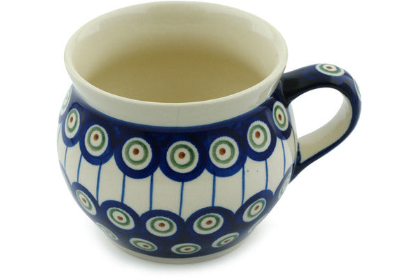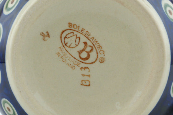This Traditional Peacock 16 oz Bubble Mug was handmade and hand decorated in Boleslawiec, Poland by skilled artisans according to old traditional methods. This Polish stoneware is microwave, dishwasher, freezer, and oven safe up to 480°F. It does not contain lead or cadmium. It is part of the Traditional Peacock Collection.
