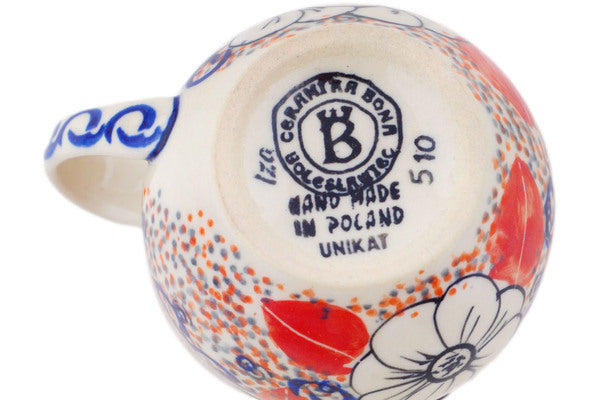 This Poppy Passion 8 oz Bubble Mug was handmade and hand decorated in Boleslawiec, Poland by skilled artisans according to old traditional methods. This is a Polish pottery Signature Unikat, which means that it has been hand painted with both sponges and brushes and it is signed by the artist who painted it. Unikat pieces are the most intricate works of art. Larger Unikat items take hours of very careful work to finish. This Polish stoneware is microwave, dishwasher, freezer, and oven safe up to 480°F. It does not contain lead or cadmium. It is part of the Poppy Passion Collection.
