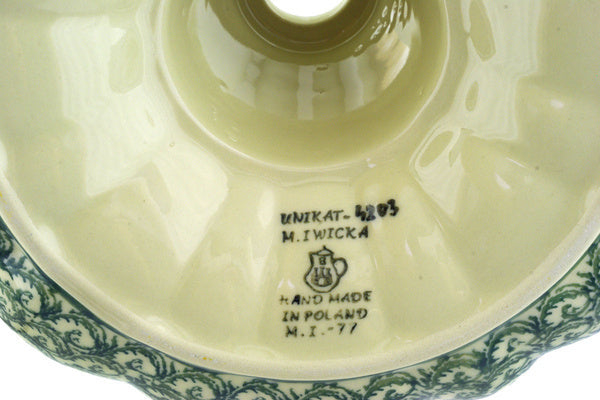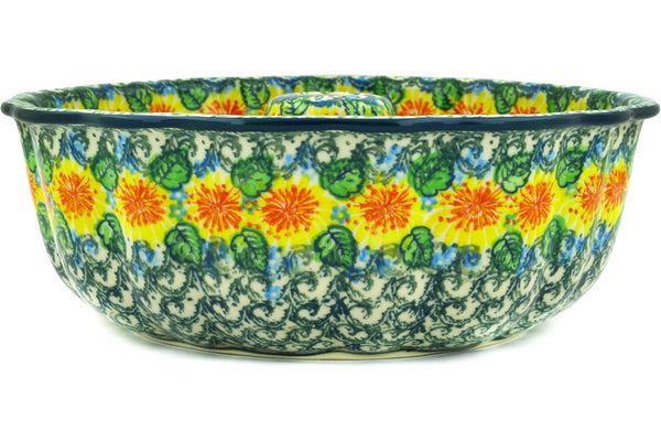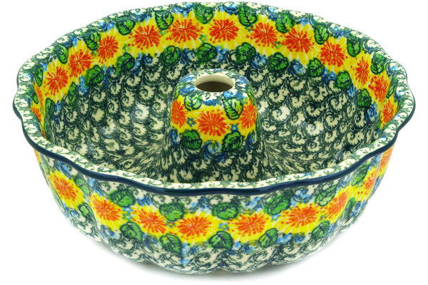 This Marigold Chain 10" Cake Mould was handmade and hand decorated in Boleslawiec, Poland by skilled artisans according to old traditional methods. This is a Polish pottery Signature Unikat, which means that it has been hand painted with both sponges and brushes and it is signed by the artist who painted it. Unikat pieces are the most intricate works of art. Larger Unikat items take hours of very careful work to finish. This Polish stoneware is microwave, dishwasher, freezer, and oven safe up to 480°F. It does not contain lead or cadmium. It is part of the Marigold Chain Collection.