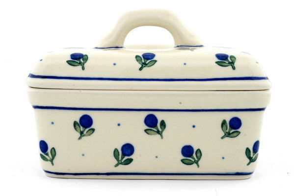 This Blue Buds 5" Butter box was handmade and hand decorated in Boleslawiec, Poland by skilled artisans according to old traditional methods. This Polish stoneware is microwave, dishwasher, freezer, and oven safe up to 480°F. It does not contain lead or cadmium. It is part of the Blue Buds Collection.