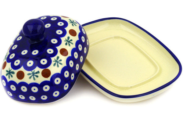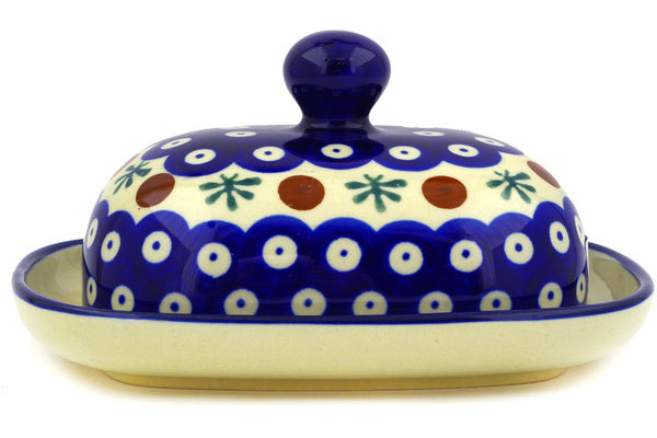 This Mosquito 6" Butter Dish was handmade and hand decorated in Boleslawiec, Poland by skilled artisans according to old traditional methods. This Polish stoneware is microwave, dishwasher, freezer, and oven safe up to 480°F. It does not contain lead or cadmium. It is part of the Mosquito Collection.