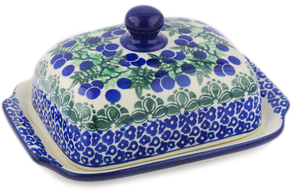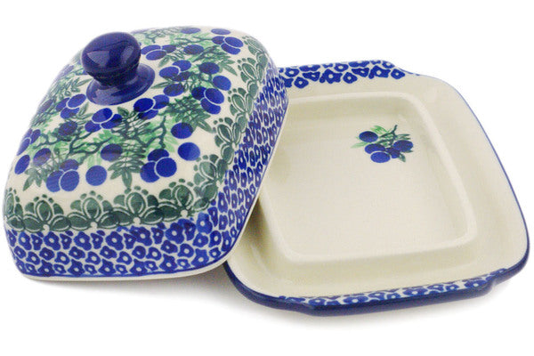 This Blueberry Fields Forever 7" Butter Dish was handmade and hand decorated in Boleslawiec, Poland by skilled artisans according to old traditional methods. This Polish stoneware is microwave, dishwasher, freezer, and oven safe up to 480°F. It does not contain lead or cadmium. It is part of the Blueberry Fields Forever Collection.