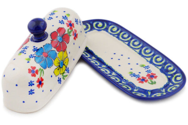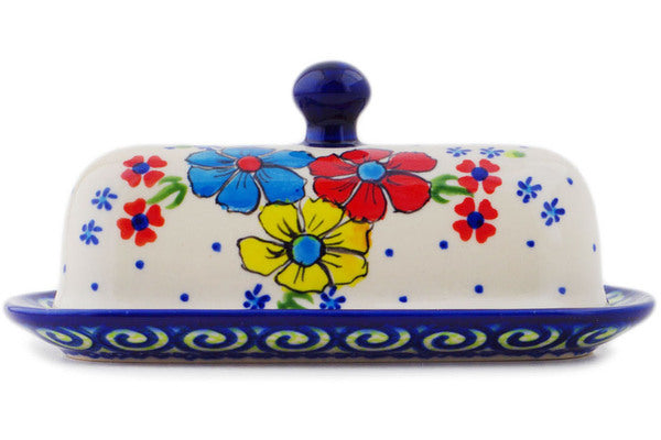 This Country Three 7" Butter Dish was handmade and hand decorated in Boleslawiec, Poland by skilled artisans according to old traditional methods. This is a Polish pottery Signature Unikat, which means that it has been hand painted with both sponges and brushes and it is signed by the artist who painted it. Unikat pieces are the most intricate works of art. Larger Unikat items take hours of very careful work to finish. This Polish stoneware is microwave, dishwasher, freezer, and oven safe up to 480°F. It does not contain lead or cadmium. It is part of the Country Three Collection.