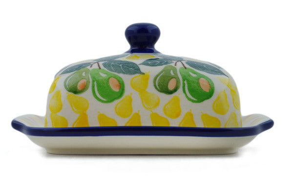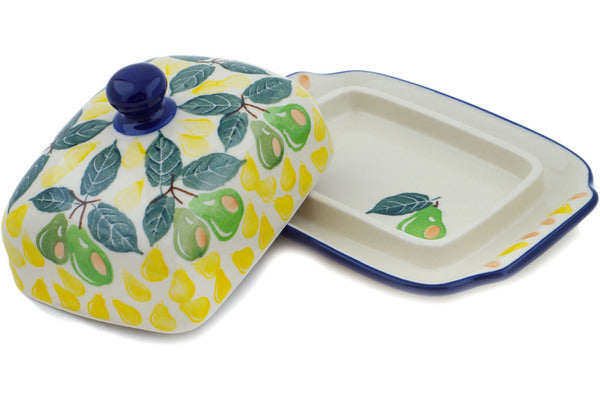 This Fresh Pear 7" Butter Dish was handmade and hand decorated in Boleslawiec, Poland by skilled artisans according to old traditional methods. This Polish stoneware is microwave, dishwasher, freezer, and oven safe up to 480°F. It does not contain lead or cadmium. It is part of the Fresh Pear Collection.