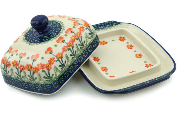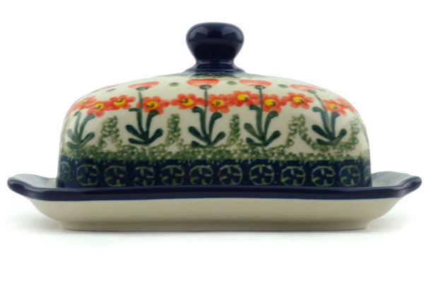 This Peach Spring Daisy 7" Butter Dish was handmade and hand decorated in Boleslawiec, Poland by skilled artisans according to old traditional methods. This Polish stoneware is microwave, dishwasher, freezer, and oven safe up to 480°F. It does not contain lead or cadmium. It is part of the Peach Spring Daisy Collection.