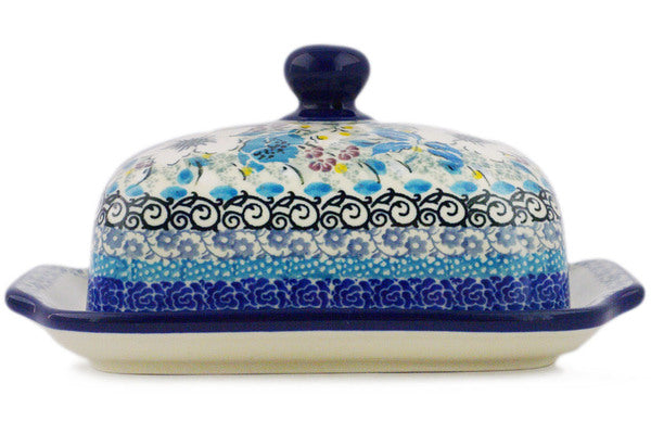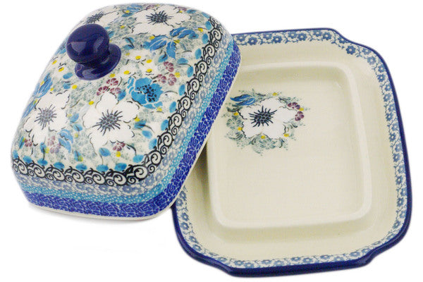 This Solstice Bloom 7" Butter Dish was handmade and hand decorated in Boleslawiec, Poland by skilled artisans according to old traditional methods. This is a Polish pottery Signature Unikat, which means that it has been hand painted with both sponges and brushes and it is signed by the artist who painted it. Unikat pieces are the most intricate works of art. Larger Unikat items take hours of very careful work to finish. This Polish stoneware is microwave, dishwasher, freezer, and oven safe up to 480°F. It does not contain lead or cadmium. It is part of the Solstice Bloom Collection.