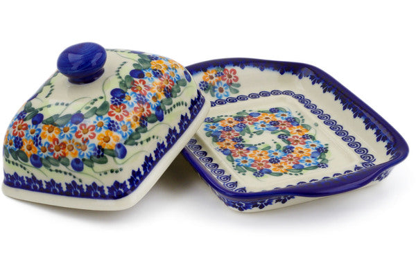 This Starburst Garland 7" Butter Dish was handmade and hand decorated in Boleslawiec, Poland by skilled artisans according to old traditional methods. This is a Polish pottery Signature Unikat, which means that it has been hand painted with both sponges and brushes and it is signed by the artist who painted it. Unikat pieces are the most intricate works of art. Larger Unikat items take hours of very careful work to finish. This Polish stoneware is microwave, dishwasher, freezer, and oven safe up to 480°F. It does not contain lead or cadmium. It is part of the Starburst Garland Collection.
