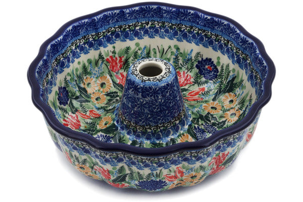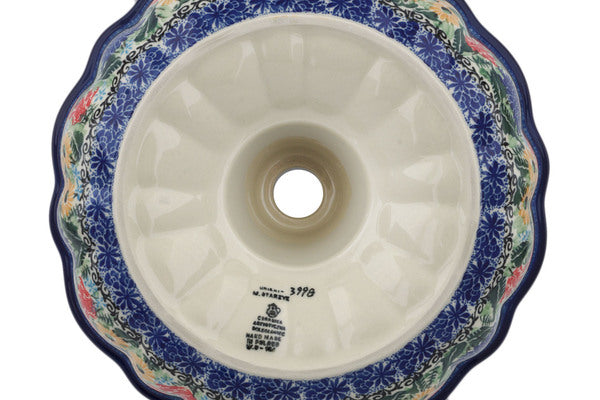This Splendid Blue Bell 10" Cake Mould was handmade and hand decorated in Boleslawiec, Poland by skilled artisans according to old traditional methods. This is a Polish pottery Signature Unikat, which means that it has been hand painted with both sponges and brushes and it is signed by the artist who painted it. Unikat pieces are the most intricate works of art. Larger Unikat items take hours of very careful work to finish. This Polish stoneware is microwave, dishwasher, freezer, and oven safe up to 480°F. It does not contain lead or cadmium. It is part of the Splendid Blue Bell Collection.