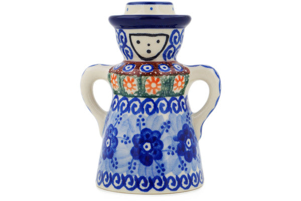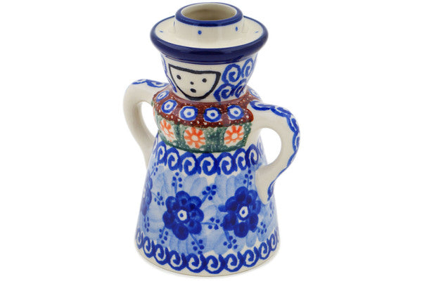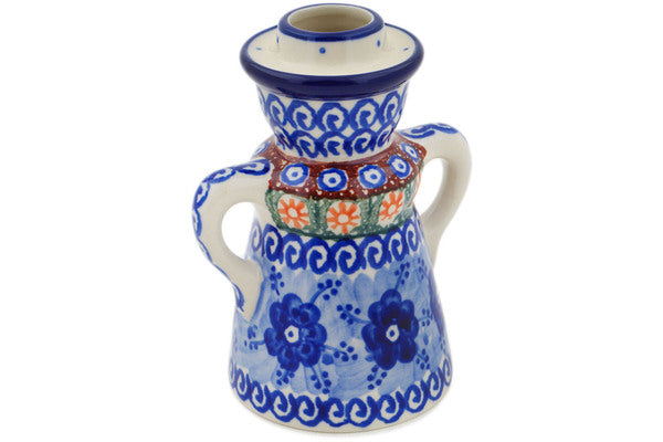 This Dancing Blue Poppies 5" Candle Holder was handmade and hand decorated in Boleslawiec, Poland by skilled artisans according to old traditional methods. This is a Polish pottery Signature Unikat, which means that it has been hand painted with both sponges and brushes and it is signed by the artist who painted it. Unikat pieces are the most intricate works of art. Larger Unikat items take hours of very careful work to finish. This Polish stoneware is microwave, dishwasher, freezer, and oven safe up to 480°F. It does not contain lead or cadmium. It is part of the Dancing Blue Poppies Collection.