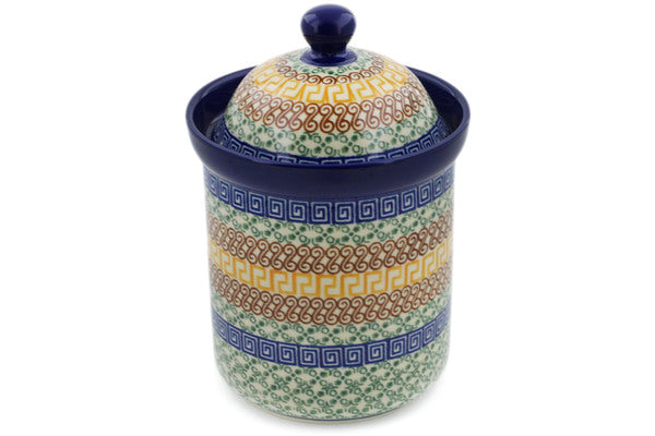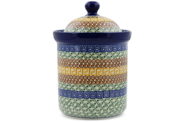 This Grecian Sea 8" Canister 8" was handmade and hand decorated in Boleslawiec, Poland by skilled artisans according to old traditional methods. This Polish stoneware is microwave, dishwasher, freezer, and oven safe up to 480°F. It does not contain lead or cadmium. It is part of the Grecian Sea Collection.