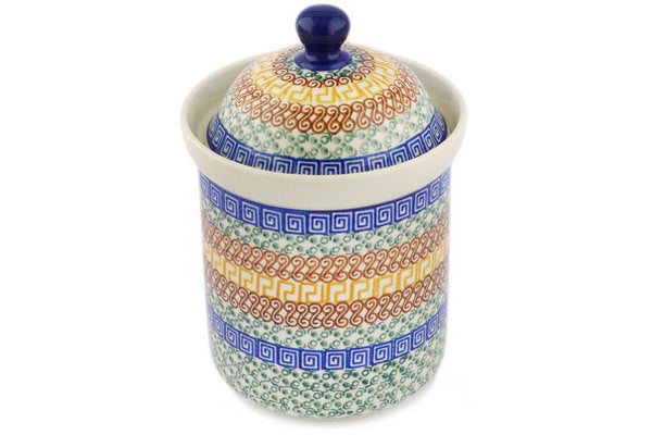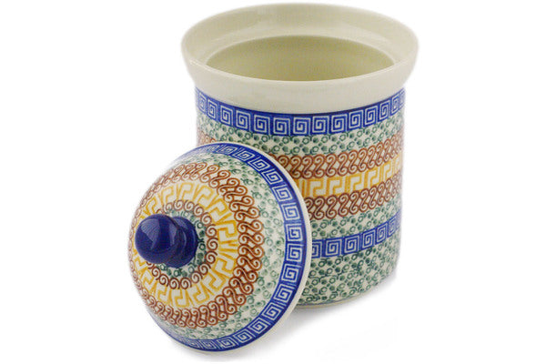 This Grecian Sea 8" Canister 8" was handmade and hand decorated in Boleslawiec, Poland by skilled artisans according to old traditional methods. This Polish stoneware is microwave, dishwasher, freezer, and oven safe up to 480°F. It does not contain lead or cadmium. It is part of the Grecian Sea Collection.