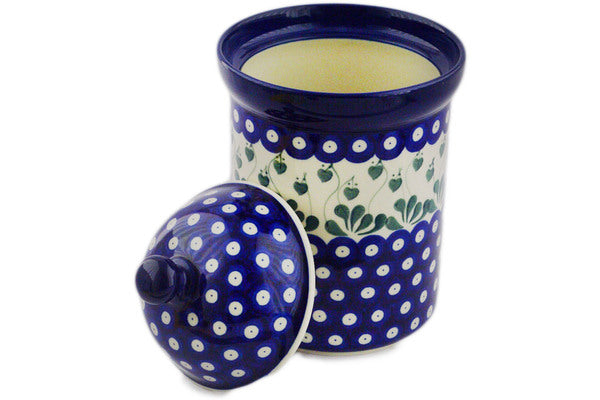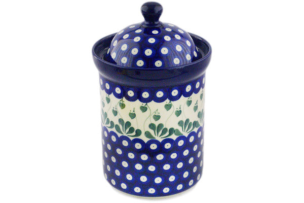 This Bleeding Heart Peacock 9" Canister 9" was handmade and hand decorated in Boleslawiec, Poland by skilled artisans according to old traditional methods. This Polish stoneware is microwave, dishwasher, freezer, and oven safe up to 480°F. It does not contain lead or cadmium. It is part of the Bleeding Heart Peacock Collection.