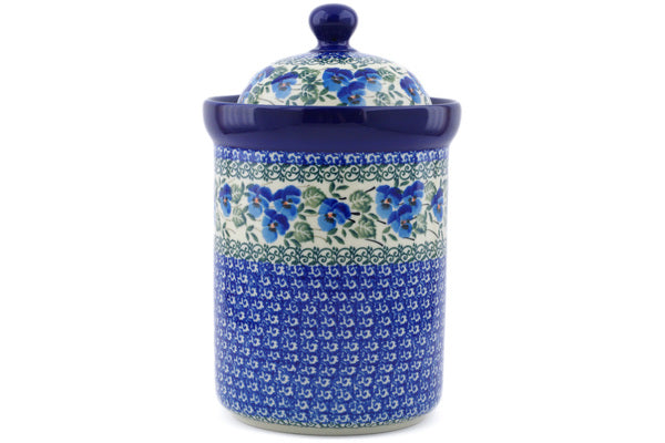 This Blue Pansy 9" Canister 9" was handmade and hand decorated in Boleslawiec, Poland by skilled artisans according to old traditional methods. This Polish stoneware is microwave, dishwasher, freezer, and oven safe up to 480°F. It does not contain lead or cadmium. It is part of the Blue Pansy Collection.