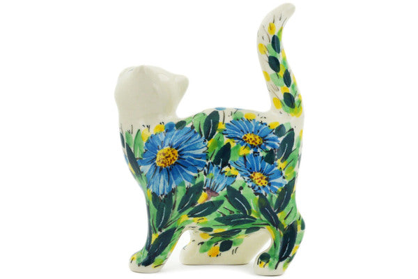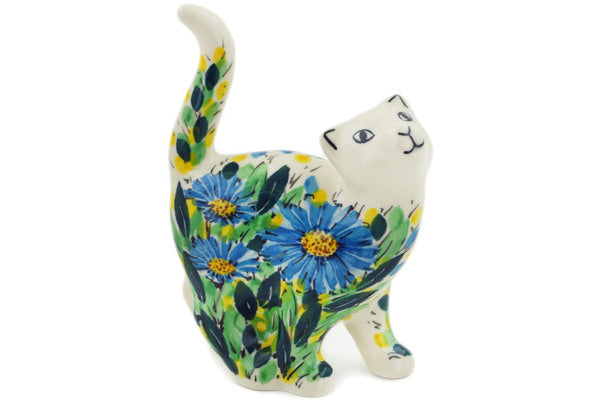 This Blue Daisy 5" Cat Figurine was handmade and hand decorated in Boleslawiec, Poland by skilled artisans according to old traditional methods. This is a Polish pottery Signature Unikat, which means that it has been hand painted with both sponges and brushes and it is signed by the artist who painted it. Unikat pieces are the most intricate works of art. Larger Unikat items take hours of very careful work to finish. This Polish stoneware is microwave, dishwasher, freezer, and oven safe up to 480°F. It does not contain lead or cadmium. It is part of the Blue Daisy Collection.