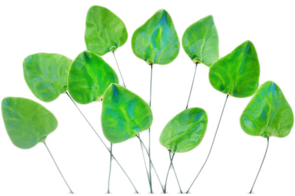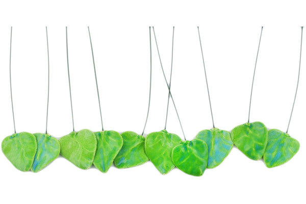 This Green 11" Set of 10 ceramic leaves was handmade and hand decorated in Boleslawiec, Poland by skilled artisans according to old traditional methods. This Polish stoneware is microwave, dishwasher, freezer, and oven safe up to 480°F. It does not contain lead or cadmium. It is part of the Green Collection.