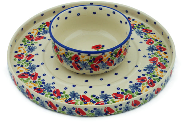 This Flower Garden 13" Chip and Dip and Cake Stand Combo was handmade and hand decorated in Boleslawiec, Poland by skilled artisans according to old traditional methods. This is a Polish pottery Signature Unikat, which means that it has been hand painted with both sponges and brushes and it is signed by the artist who painted it. Unikat pieces are the most intricate works of art. Larger Unikat items take hours of very careful work to finish. This Polish stoneware is microwave, dishwasher, freezer, and oven safe up to 480°F. It does not contain lead or cadmium. It is part of the Flower Garden Collection.