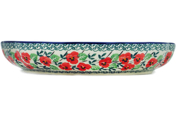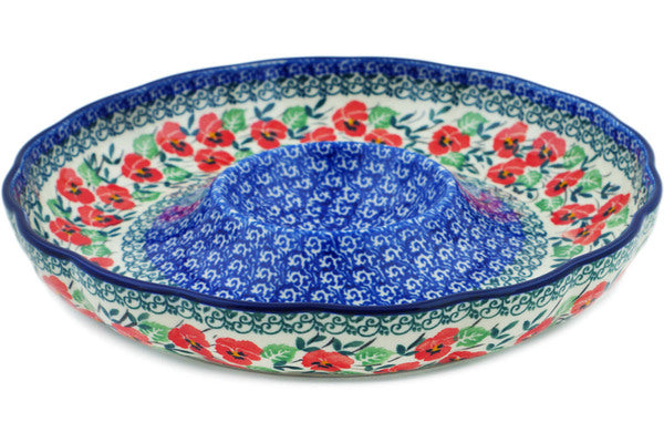 This Red Pansy 10" Chip and Dip Platter was handmade and hand decorated in Boleslawiec, Poland by skilled artisans according to old traditional methods. This Polish stoneware is microwave, dishwasher, freezer, and oven safe up to 480°F. It does not contain lead or cadmium. It is part of the Red Pansy Collection.