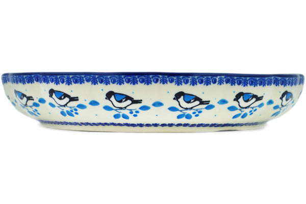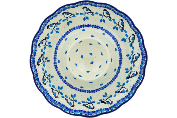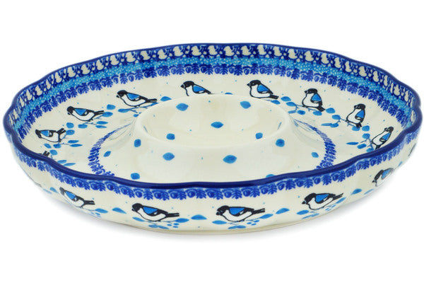 This Winter Sparrow 10" Chip and Dip Platter was handmade and hand decorated in Boleslawiec, Poland by skilled artisans according to old traditional methods. This Polish stoneware is microwave, dishwasher, freezer, and oven safe up to 480°F. It does not contain lead or cadmium. It is part of the Winter Sparrow Collection.