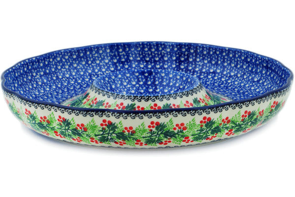 This Blooming Rowan 12" Chip and Dip Platter was handmade and hand decorated in Boleslawiec, Poland by skilled artisans according to old traditional methods. This Polish stoneware is microwave, dishwasher, freezer, and oven safe up to 480°F. It does not contain lead or cadmium. It is part of the Blooming Rowan Collection.