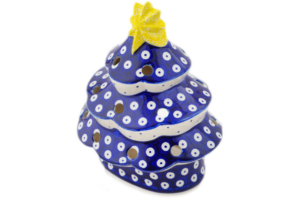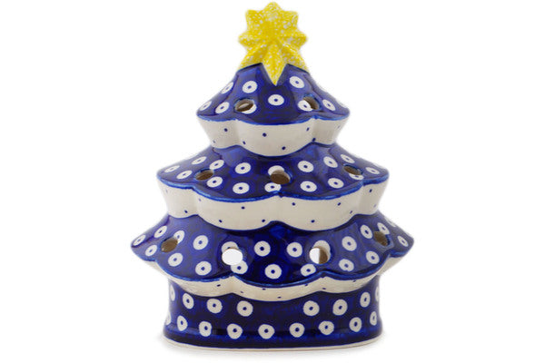 This Peacock Eyes 7" Christmas Tree Candle Holder was handmade and hand decorated in Boleslawiec, Poland by skilled artisans according to old traditional methods. This Polish stoneware is microwave, dishwasher, freezer, and oven safe up to 480°F. It does not contain lead or cadmium. It is part of the Peacock Eyes Collection.