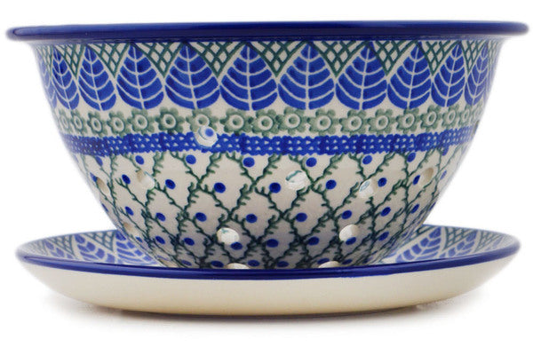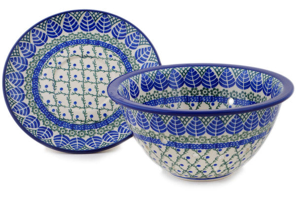 This Blue Alpine 8" Colander with Plate was handmade and hand decorated in Boleslawiec, Poland by skilled artisans according to old traditional methods. This Polish stoneware is microwave, dishwasher, freezer, and oven safe up to 480°F. It does not contain lead or cadmium. It is part of the Blue Alpine Collection.