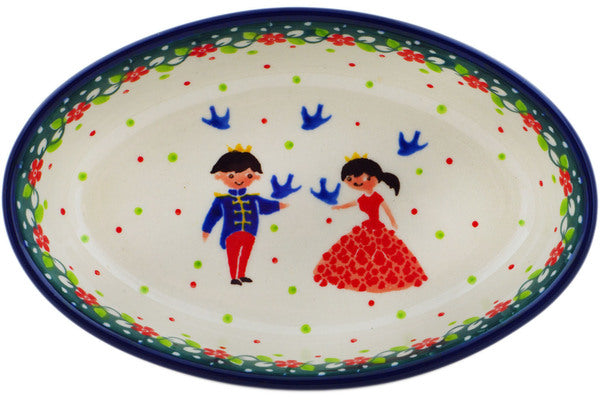 This Bird Prince And Princess 6" Condiment Dish was handmade and hand decorated in Boleslawiec, Poland by skilled artisans according to old traditional methods. This is a Polish pottery Signature Unikat, which means that it has been hand painted with both sponges and brushes and it is signed by the artist who painted it. Unikat pieces are the most intricate works of art. Larger Unikat items take hours of very careful work to finish. This Polish stoneware is microwave, dishwasher, freezer, and oven safe up to 480°F. It does not contain lead or cadmium. It is part of the Bird Prince And Princess Collection.