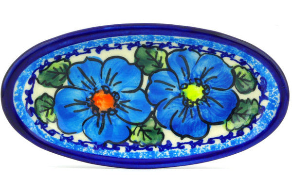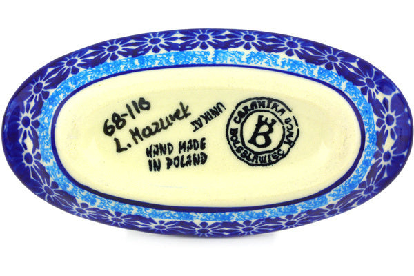 This Bold Blue Poppies 6" Condiment Dish was handmade and hand decorated in Boleslawiec, Poland by skilled artisans according to old traditional methods. This is a Polish pottery Signature Unikat, which means that it has been hand painted with both sponges and brushes and it is signed by the artist who painted it. Unikat pieces are the most intricate works of art. Larger Unikat items take hours of very careful work to finish. This Polish stoneware is microwave, dishwasher, freezer, and oven safe up to 480°F. It does not contain lead or cadmium. It is part of the Bold Blue Poppies Collection.