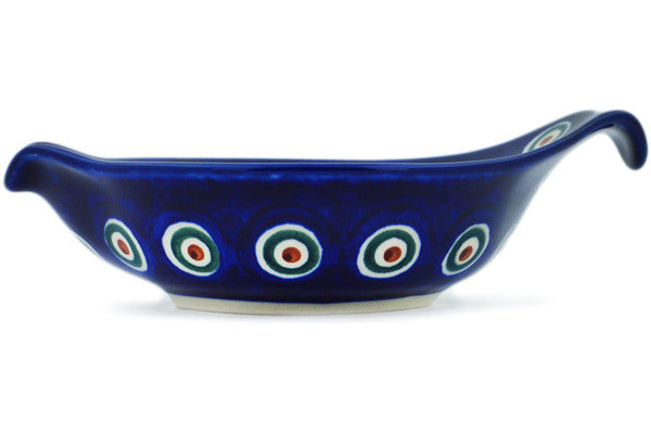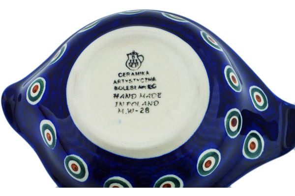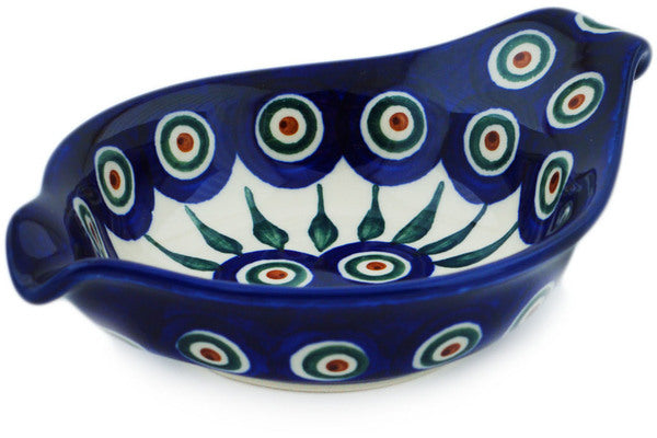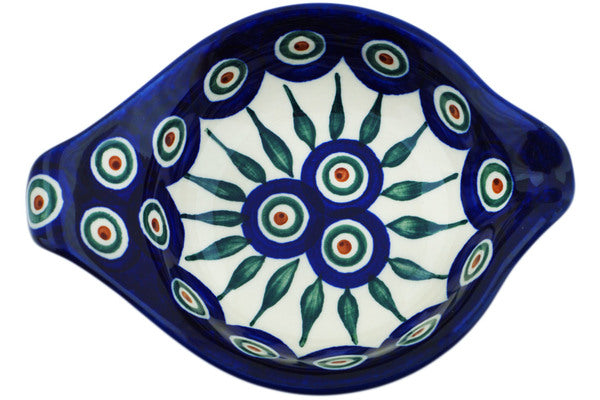 This Peacock Leaves 7" Condiment Dish was handmade and hand decorated in Boleslawiec, Poland by skilled artisans according to old traditional methods. This Polish stoneware is microwave, dishwasher, freezer, and oven safe up to 480°F. It does not contain lead or cadmium. It is part of the Peacock Leaves Collection.