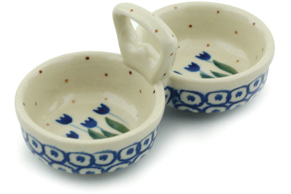 This Water Tulip 5" Condiment Dish was handmade and hand decorated in Boleslawiec, Poland by skilled artisans according to old traditional methods. This Polish stoneware is microwave, dishwasher, freezer, and oven safe up to 480°F. It does not contain lead or cadmium. It is part of the Water Tulip Collection.
