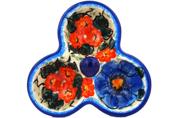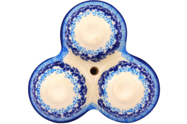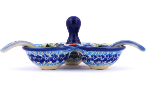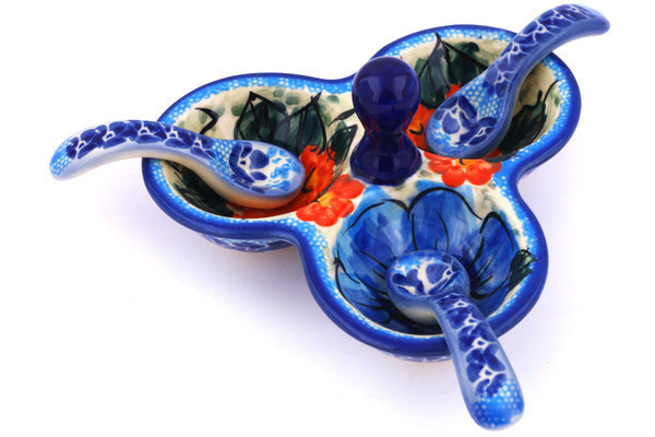 This Blue As Your Eyes Small Condiment Server with Spoons was handmade and hand decorated in Boleslawiec, Poland by skilled artisans according to old traditional methods. This is a Polish pottery Signature Unikat, which means that it has been hand painted with both sponges and brushes and it is signed by the artist who painted it. Unikat pieces are the most intricate works of art. Larger Unikat items take hours of very careful work to finish. This Polish stoneware is microwave, dishwasher, freezer, and oven safe up to 480°F. It does not contain lead or cadmium. It is part of the Blue As Your Eyes Collection.